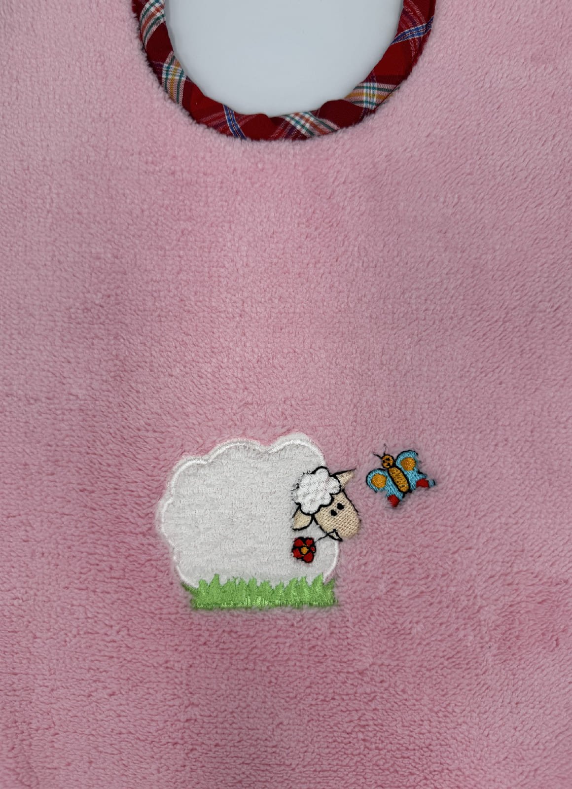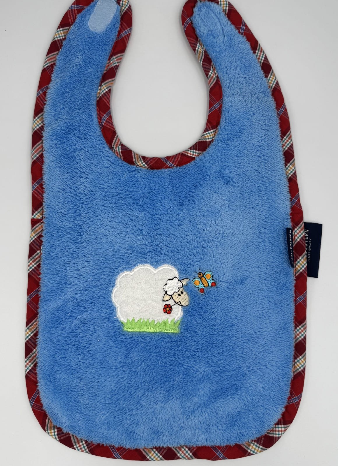 Babero grande para bebé (Riesenlatz) con cierre de velcro. En color azul, decorado con aplique de borrego y ribete de cuadros escoceses color rojo. Fabricado 100% en algodón suave y voluminoso. Lavable. 28 x 46 cm