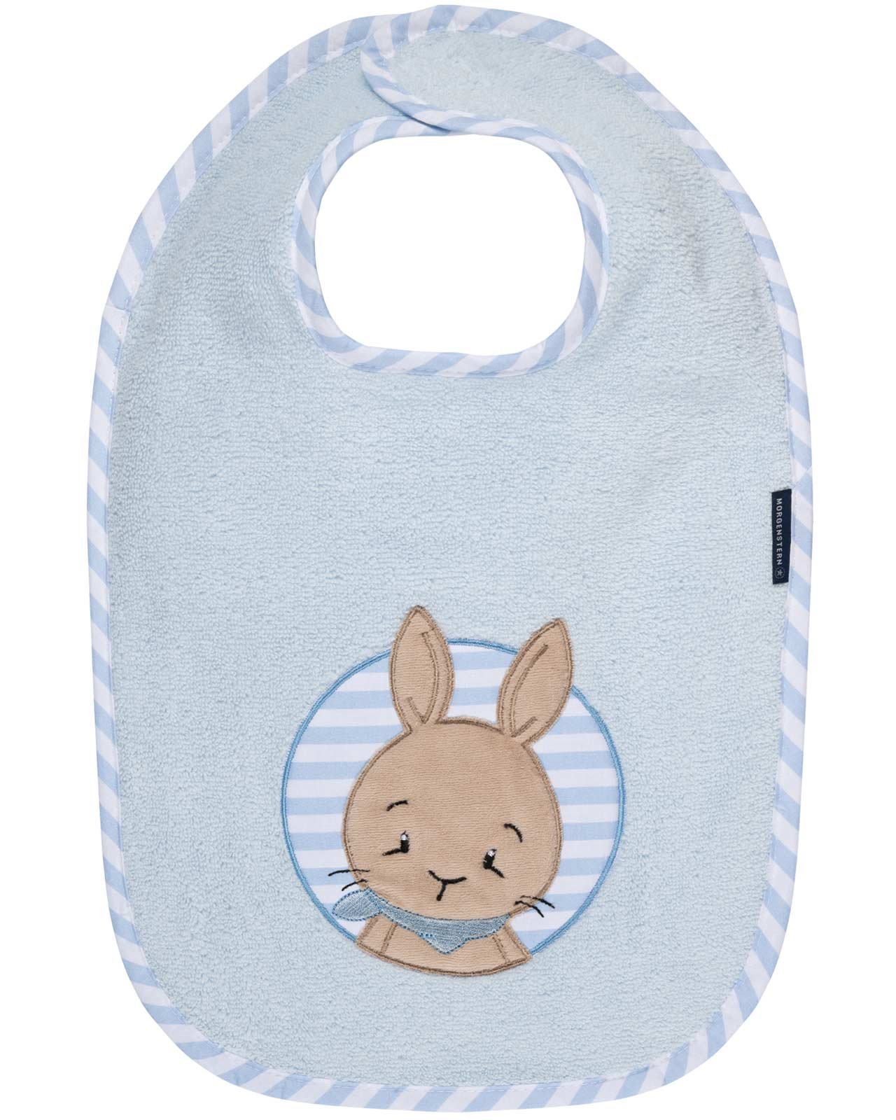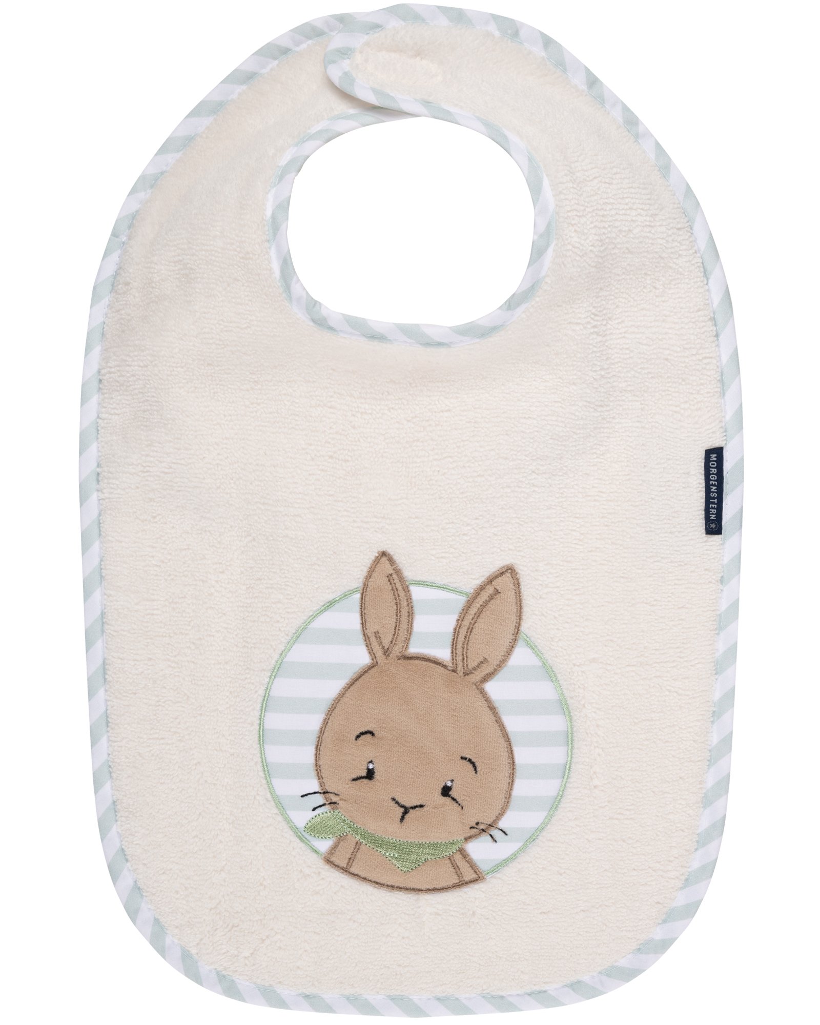 Babero grande para bebé (Riesenlatz) con cierre de velcro. Decorado con aplique de conejo y ribete de rayas. Fabricado 100% en algodón suave y voluminoso. Lavable. 28 x 46 cm