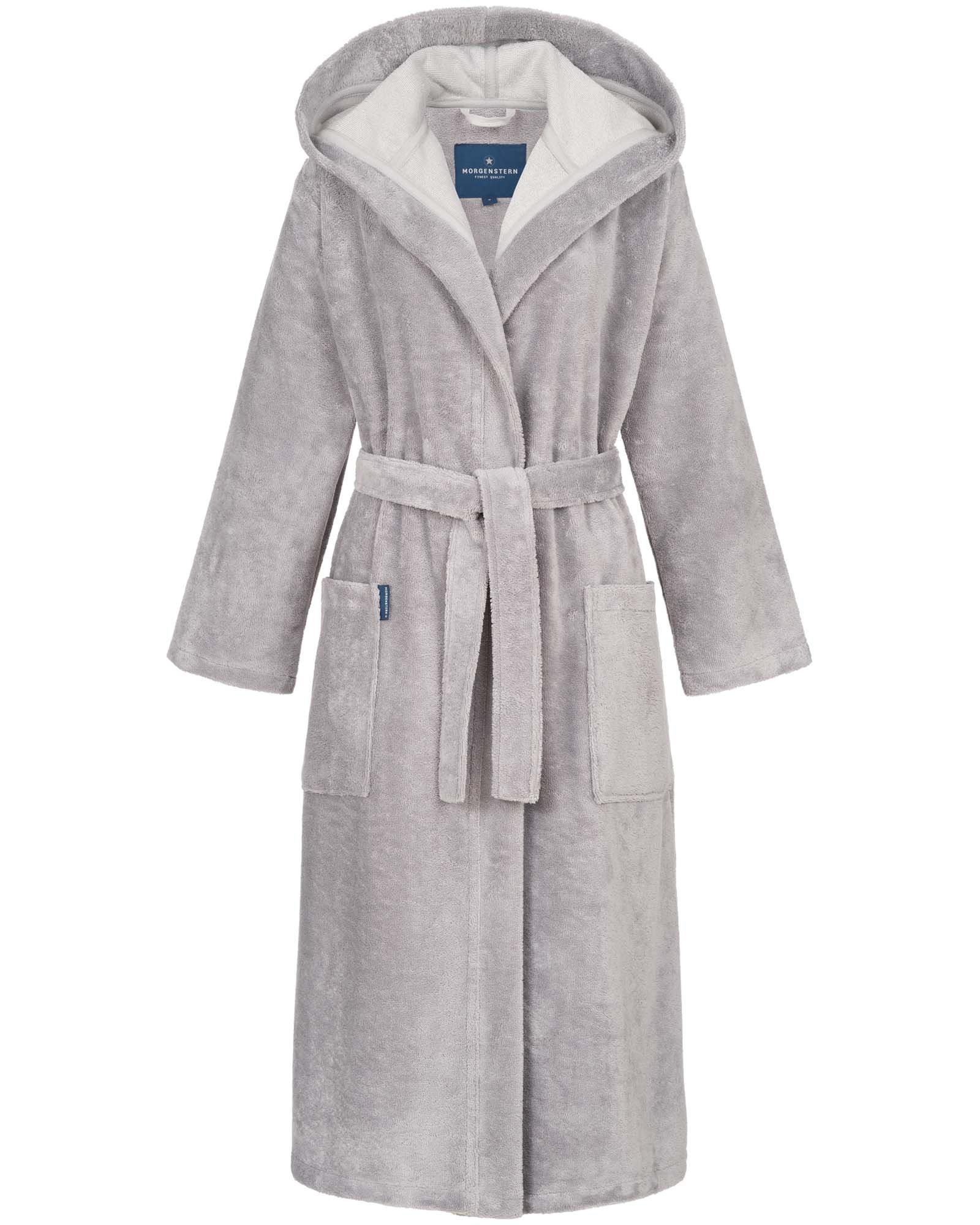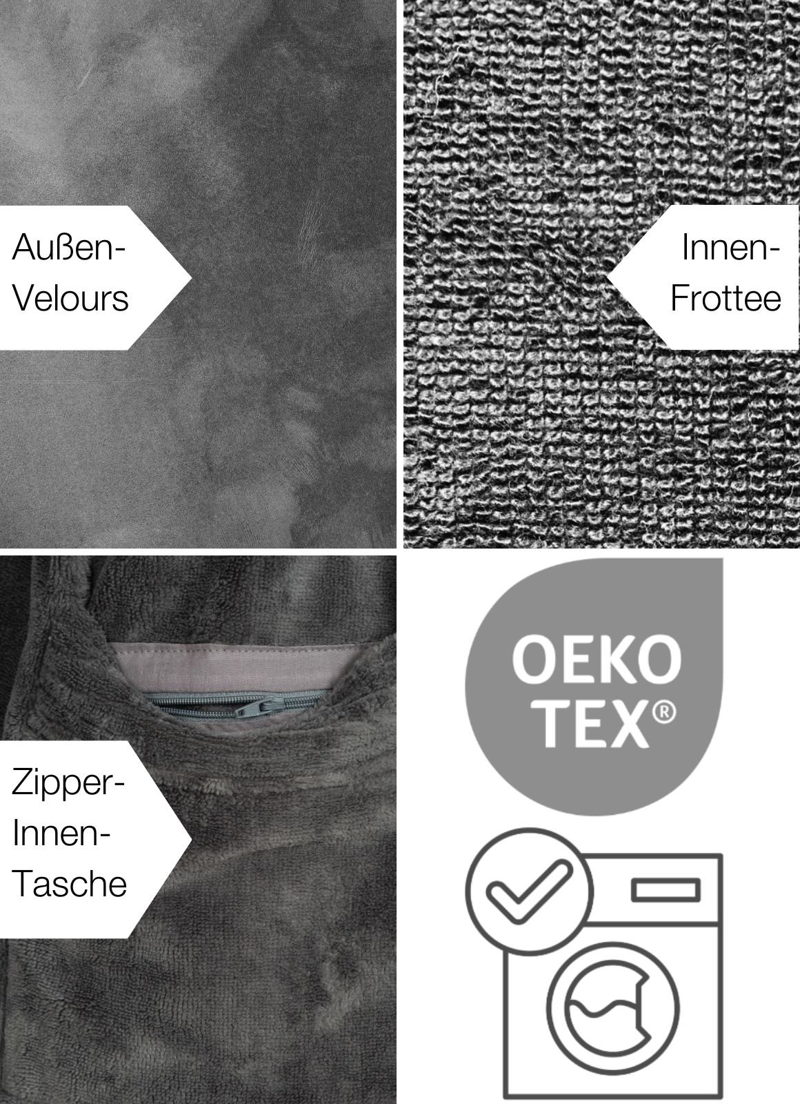 Bata para adulto modelo GEENA Kapuze, Sand (arena). Con capucha y cinta. Cuenta con dos bolsillos delanteros y uno interior con cierre. Exterior de terciopelo de microfibra fina. Interior con tela absorbente de bambú/algodón. Fabricado: 40% poliéster, 30% viscosa (bambú), 30% algodón. Certificado con el grado de prueba “Muy bueno” por sus propiedades sensoriales para la piel (número de prueba textil Wellness Tested Wellness del Instituto Hohenstein, HL 15.1.11.0364)