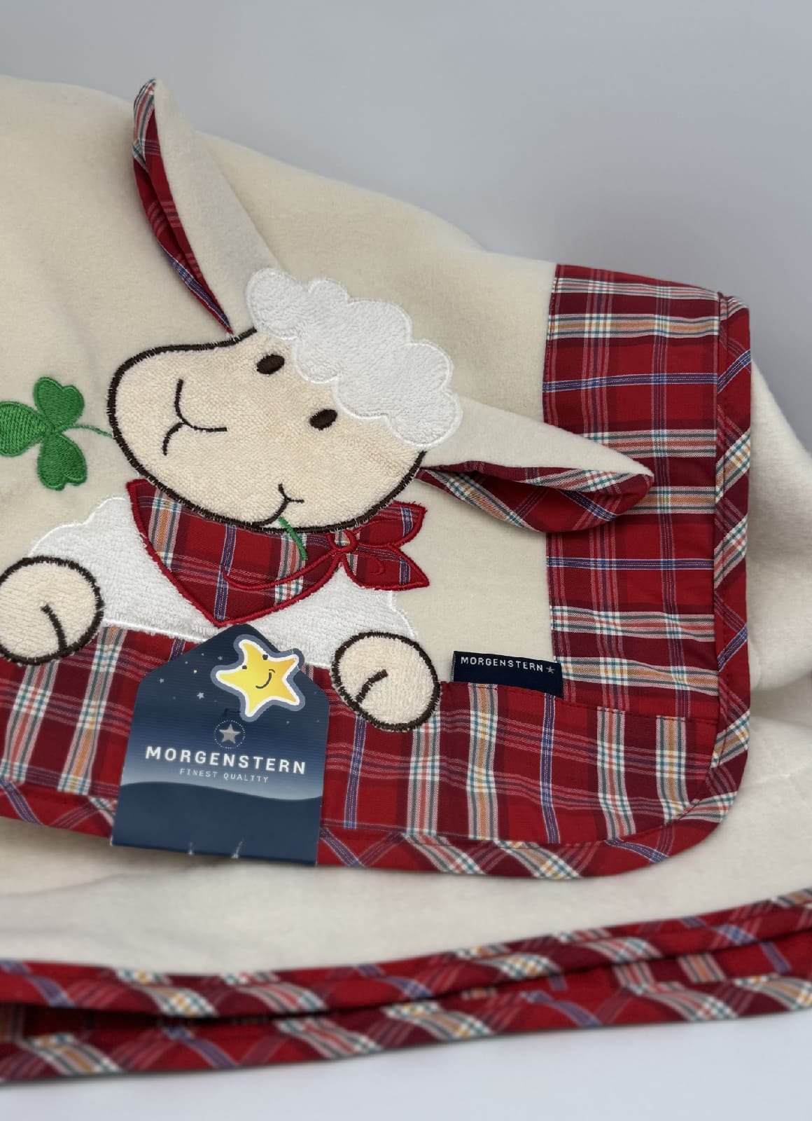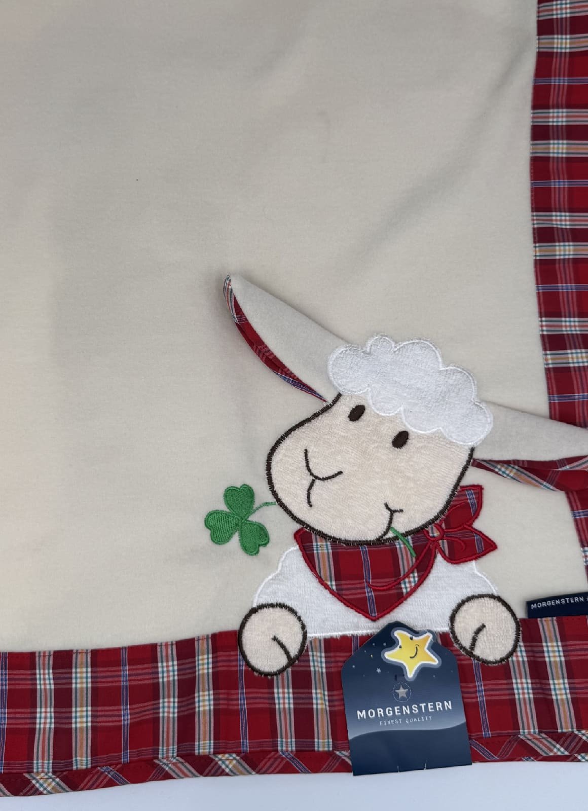 Cobija suave. En color crema, con bordes de tela decorados con aplique de rostro de borrego y cuadros escoceses rojos. Fabricado 100% en poliester voluminoso. Lavable. 75 x 100 cm
