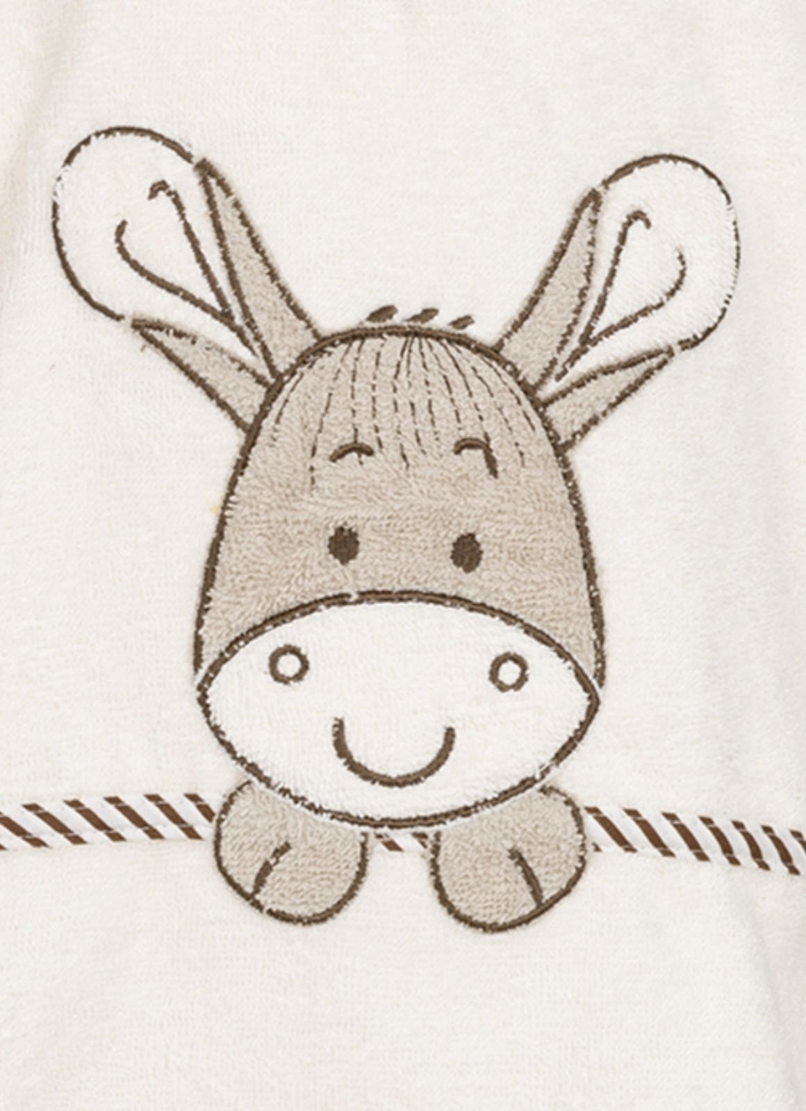 Poncho de baño con capucha y botón. En color crema, decorado con aplique de burro y ribete de rayas cafés. Fabricado 100% en algodón suave y voluminoso. Lavable. Unitalla, 1-5 años.