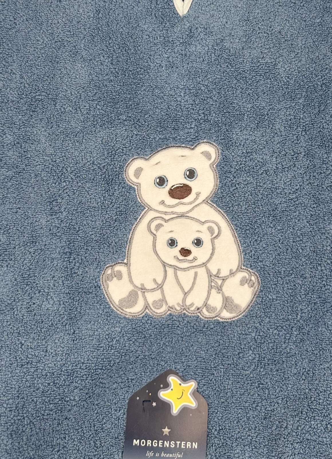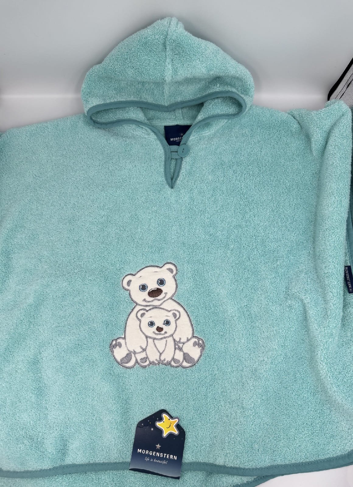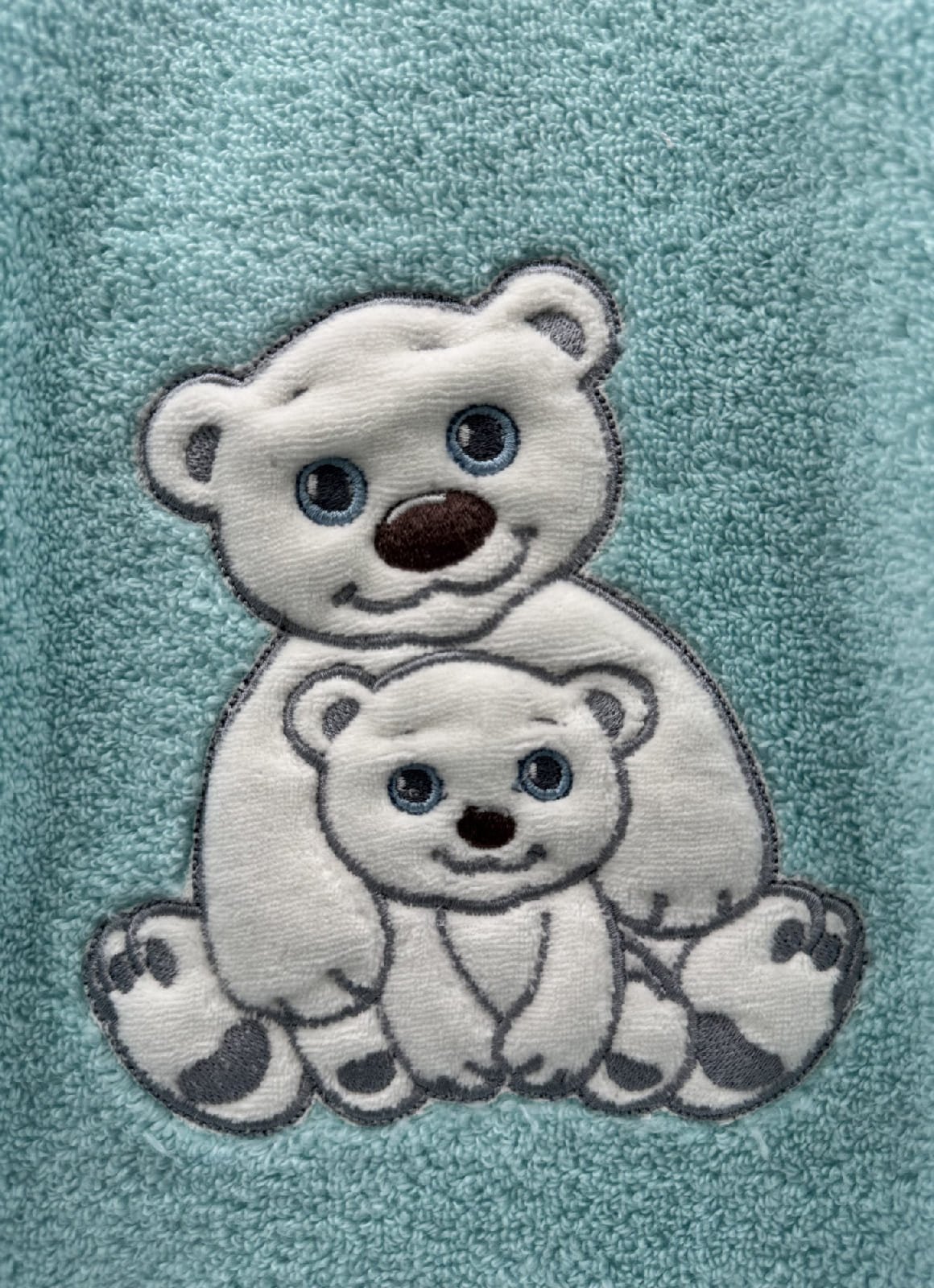 Poncho de baño con capucha y botón. En color turquesa, decorado con aplique de oso polar. Fabricado 100% en algodón suave y voluminoso. Lavable. Unitalla, 1-5 años.