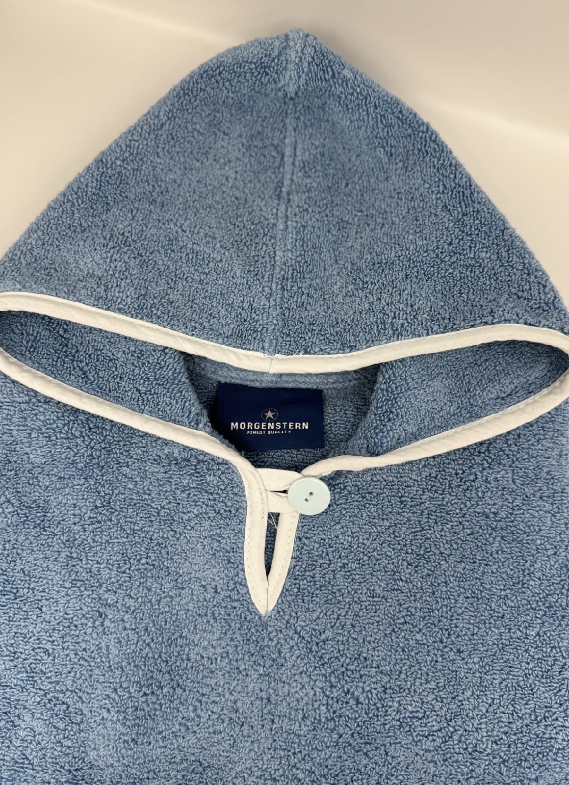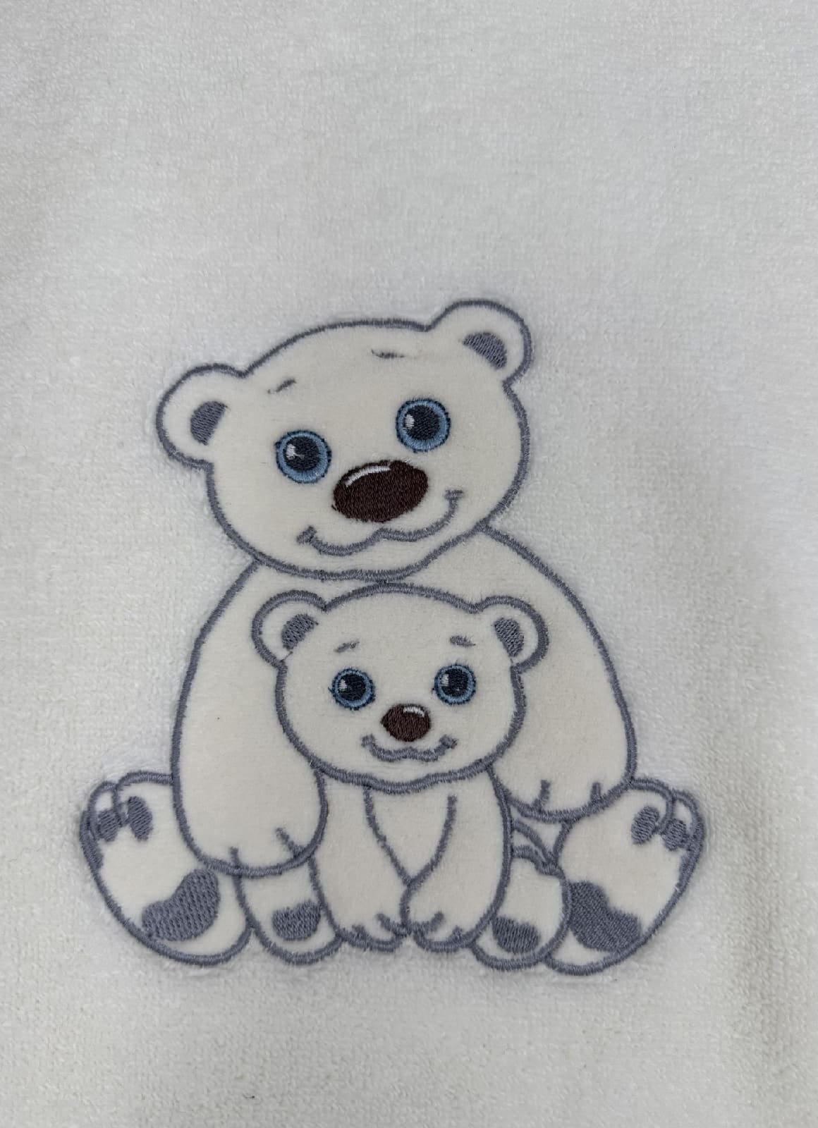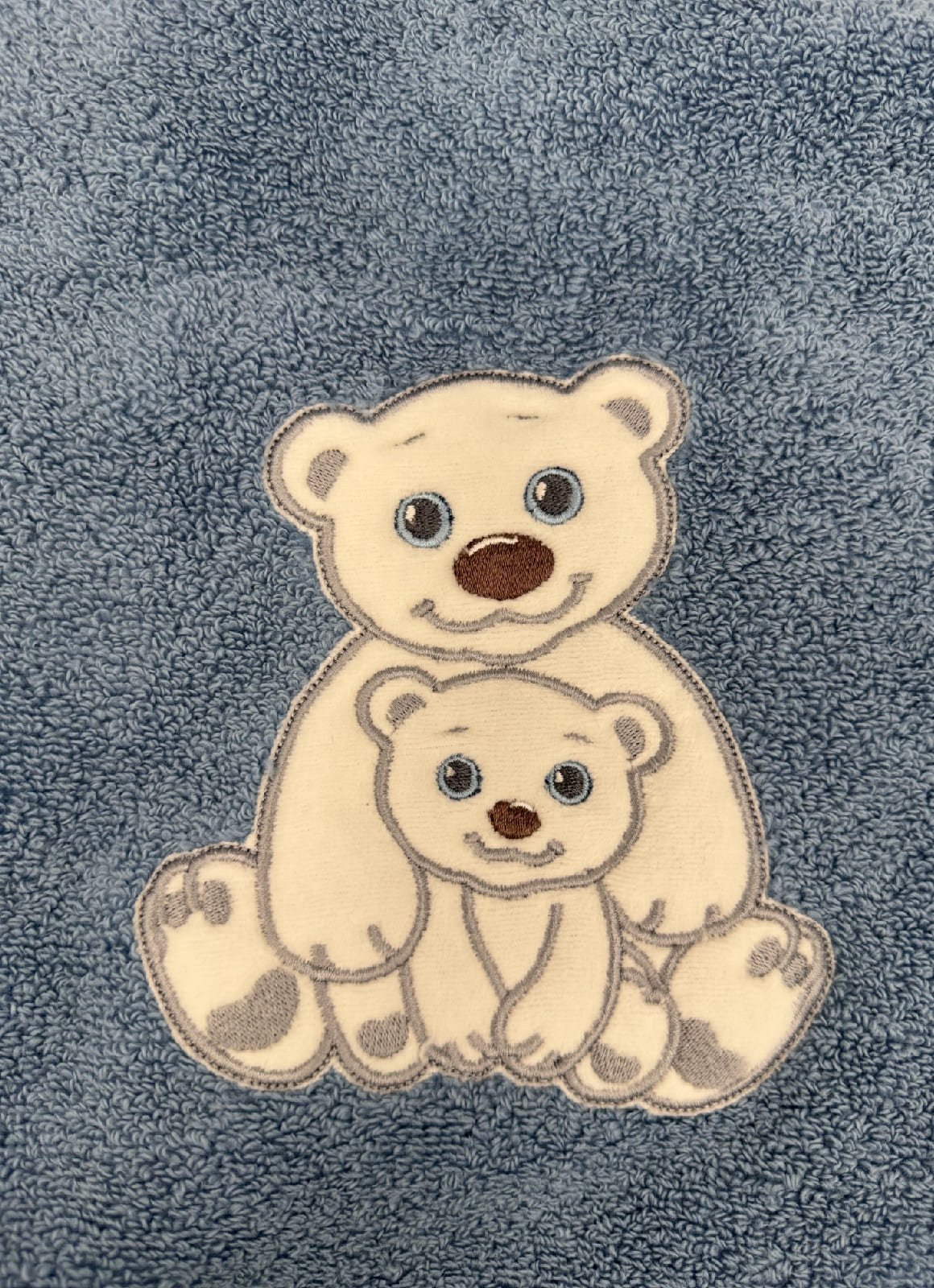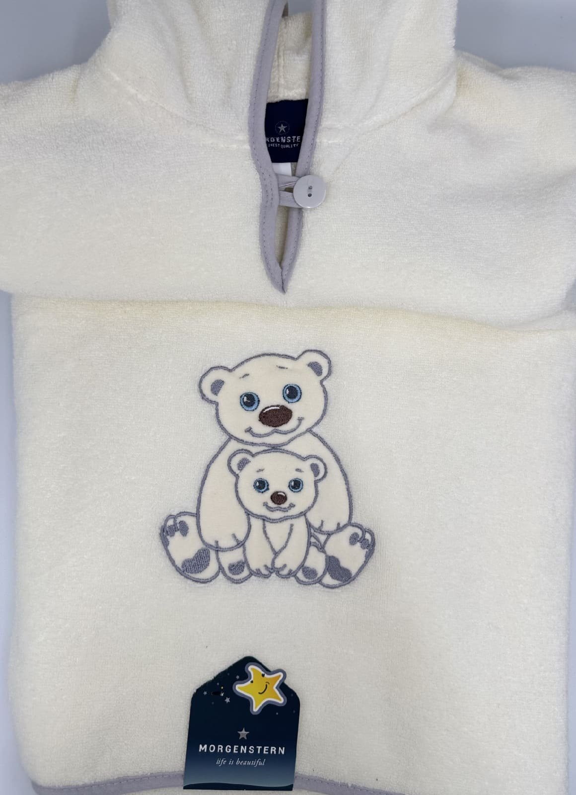 Poncho de baño con capucha y botón. En color turquesa, decorado con aplique de oso polar. Fabricado 100% en algodón suave y voluminoso. Lavable. Unitalla, 1-5 años.