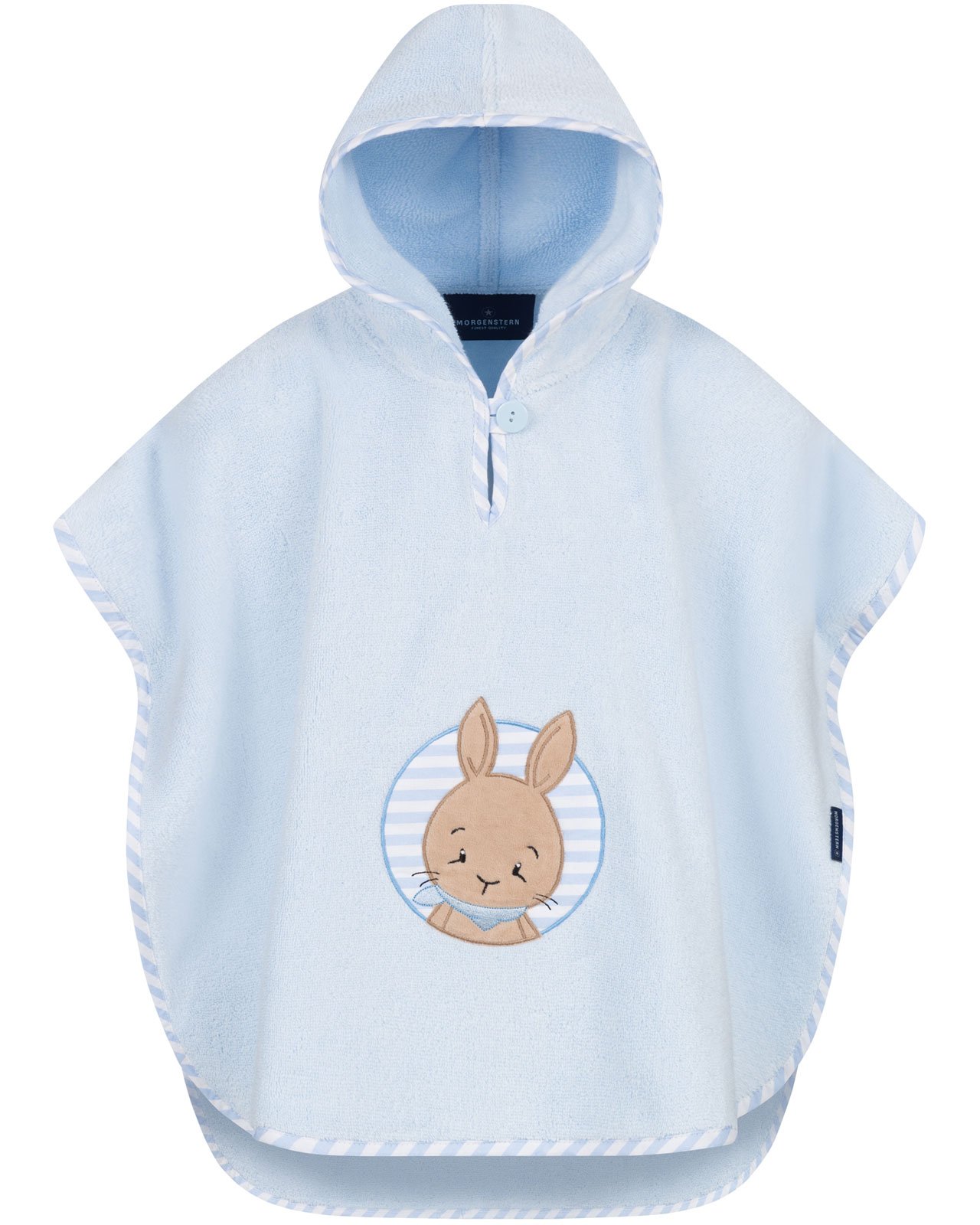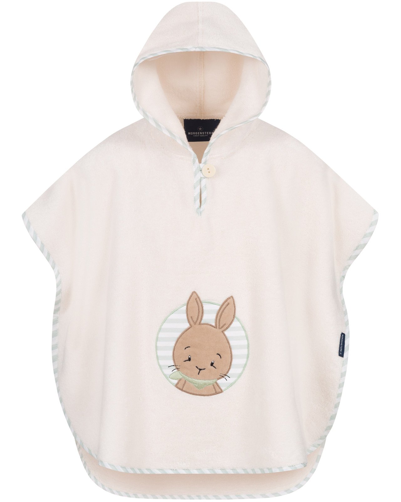 Poncho de baño con capucha y botón. En color rosa, decorado con aplique de conejo y ribete de rayas. Fabricado 100% en algodón suave y voluminoso. Lavable. Unitalla, 1-5 años.