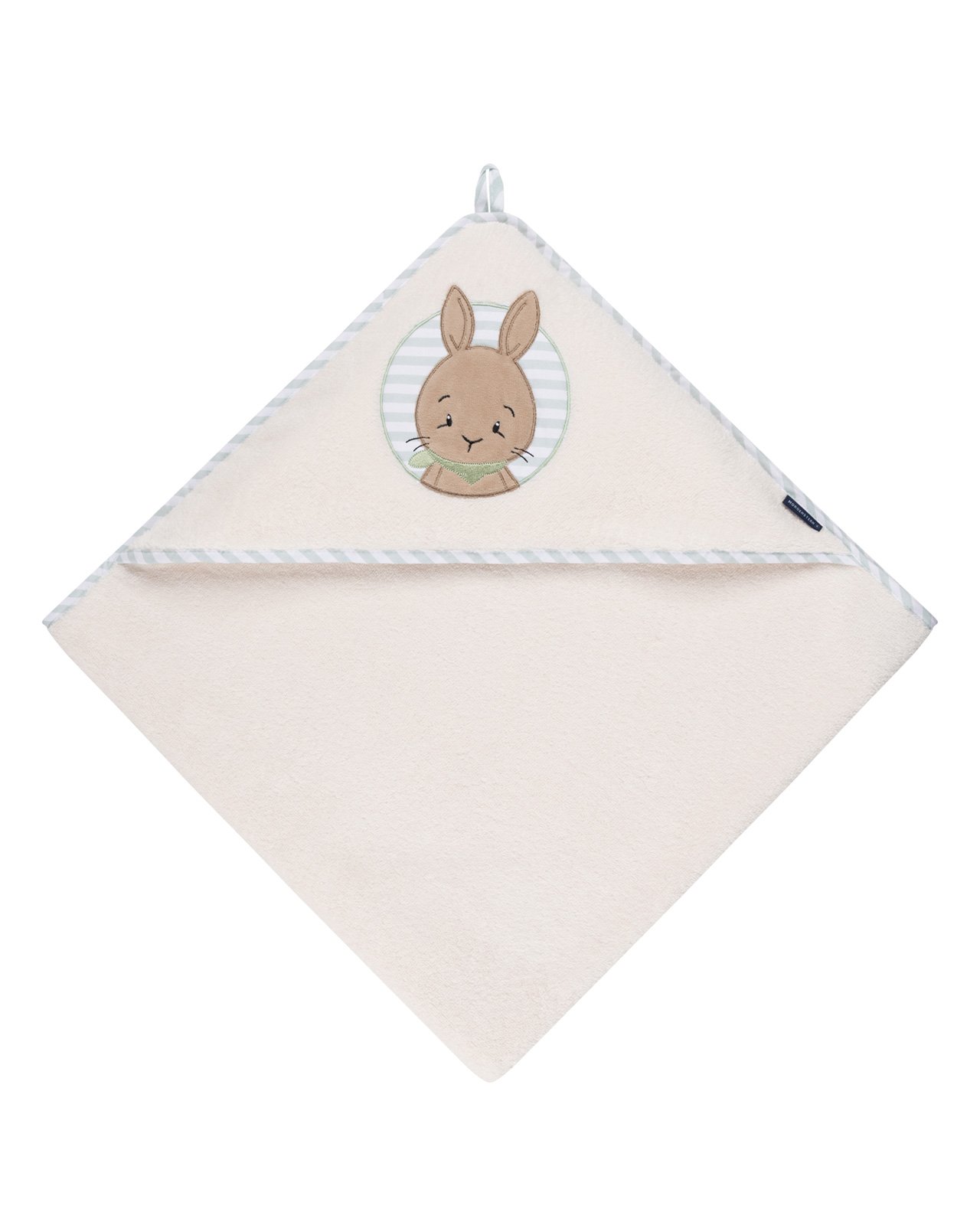 Toalla con capucha para salida de baño. (Kapuzentuch) En color azul, decorado con aplique de conejo y ribete de rayas. Fabricado 100% en algodón suave y voluminoso. Lavable. Unitalla, 100 x 100 cm
